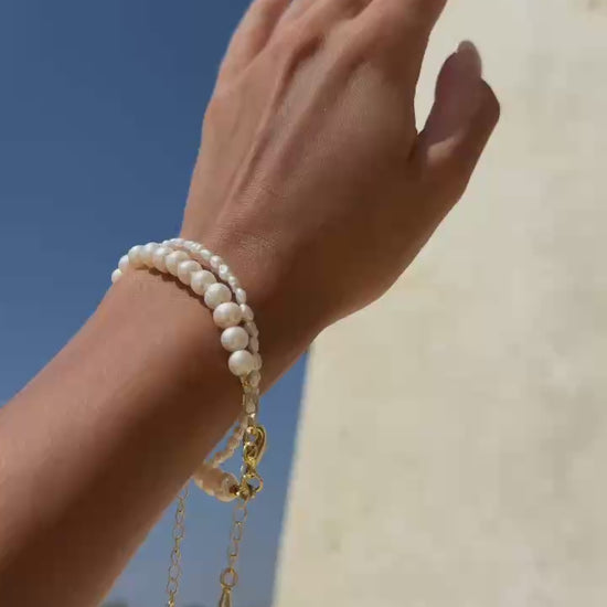 Classic Pearl Bracelet — crafted from natural round pearls, this bracelet is designed to make a statement. Its larger pearls embody timeless elegance and add a refined accent to any look.