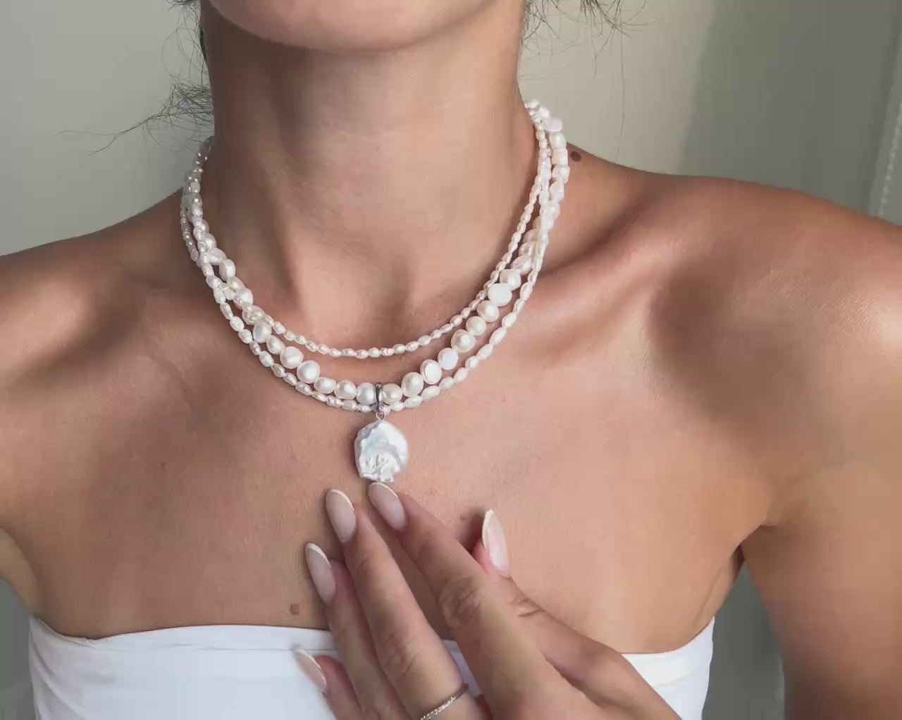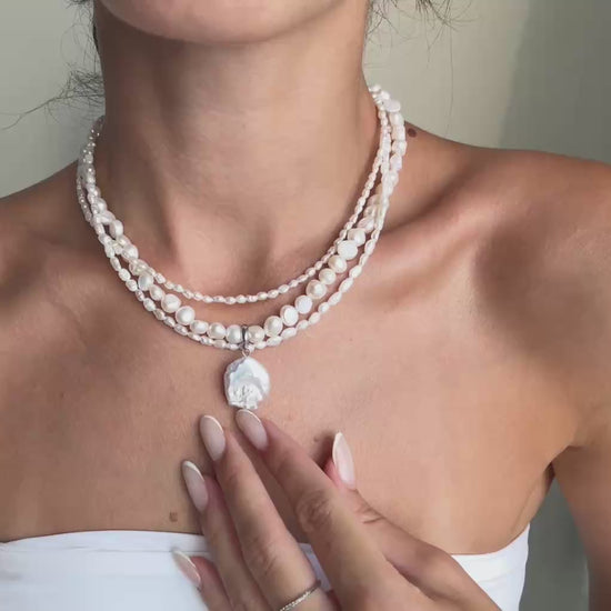 A three-layer natural pearl necklace featuring two delicate rows of mini pearls and one bold strand of larger pearls. The highlight — a detachable baroque pearl pendant that can be added or removed effortlessly, giving you the freedom to style it your way.